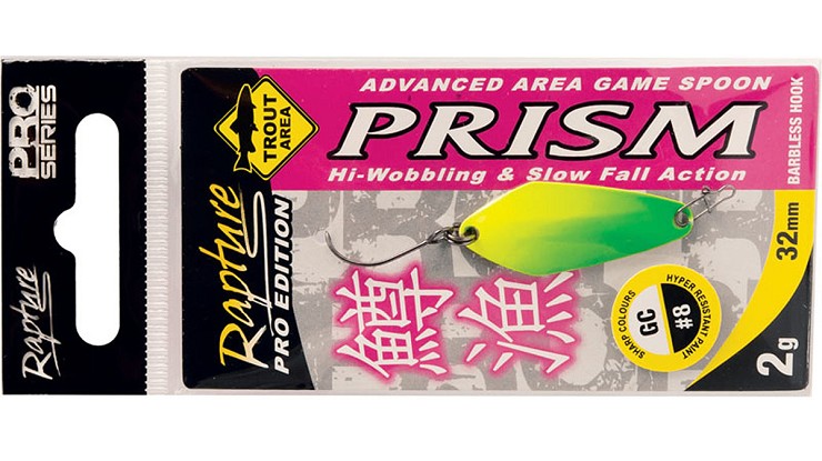 Per vincere una gara di Area Trout è fondamentale catturare il più alto numero di pesci nei minuti successivi alla partenza, per questo scopo lo Staff Rapture ha creato Prism che è in grado di sviluppare un eccellente nuoto orizzontale ad alte velocità. Quando invece la pescosità rallenta e le trote diventano più difficili, l’esecuzione di recuperi lenti genera automaticamente un moto oscillatorio irregolare irresistibile anche per i pesci più diffidenti. Prism monta amo singolo senza ardiglione e punta affilata chimicamente 3D Cut.