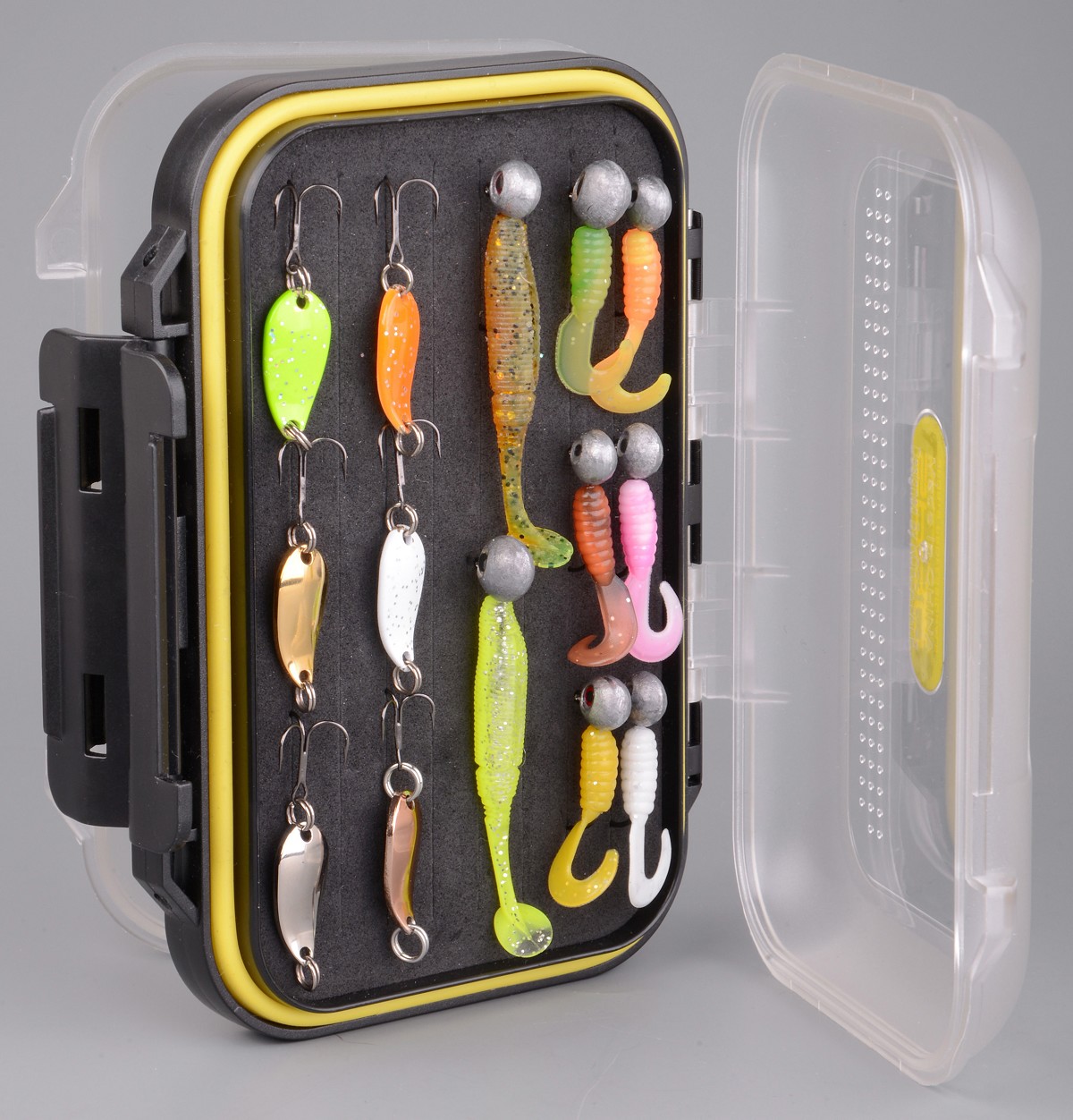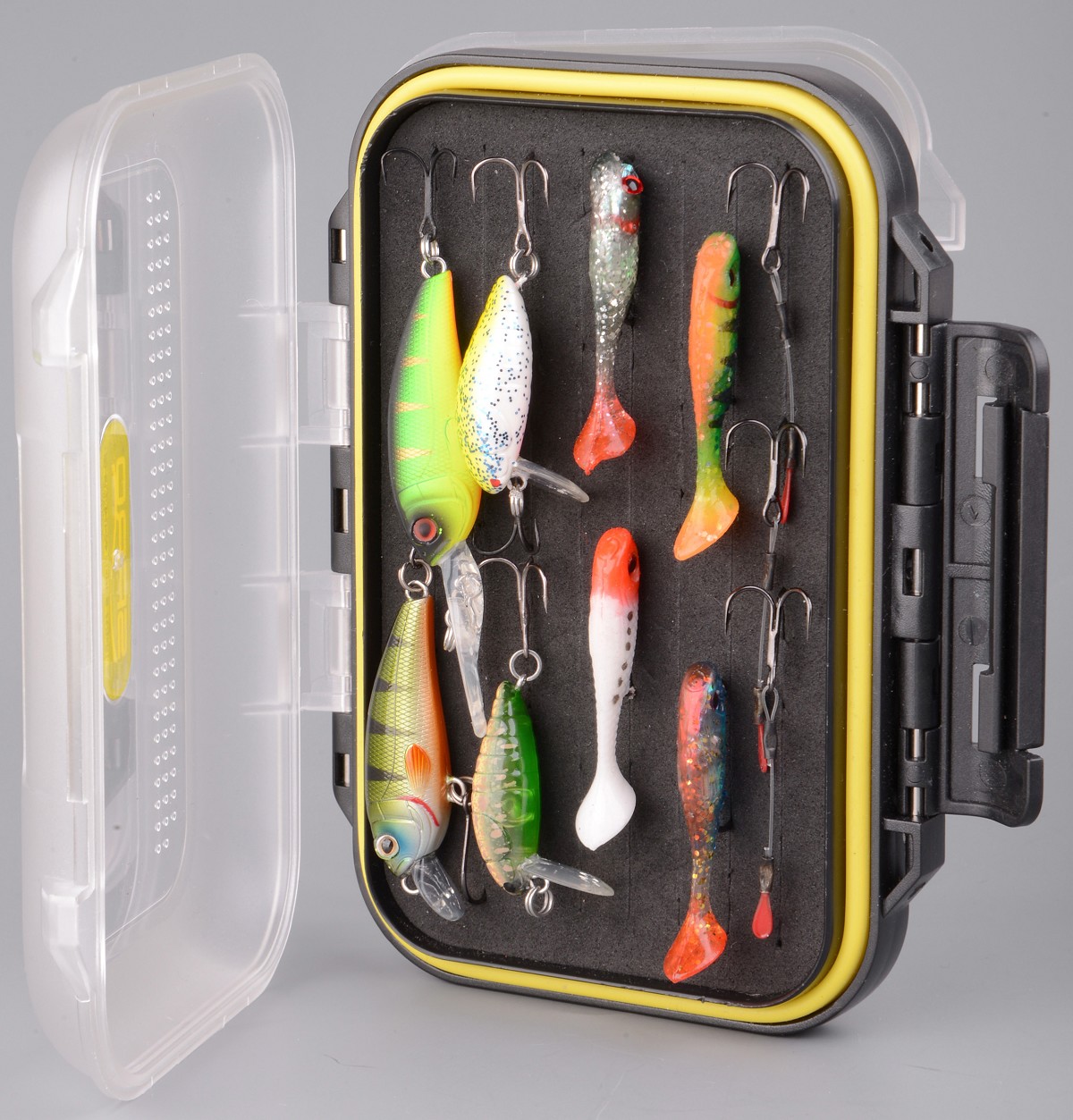 Questo box rigido ha doppia apertura e contenitore rivestito in EVA per poter alloggiare comodamente cucchiaini, microspoons ed altri piccoli artificiali come le jigheads. Entrambi i modelli sono dotati di un laccio che si può indossare al collo per un uso ancor più pratico.