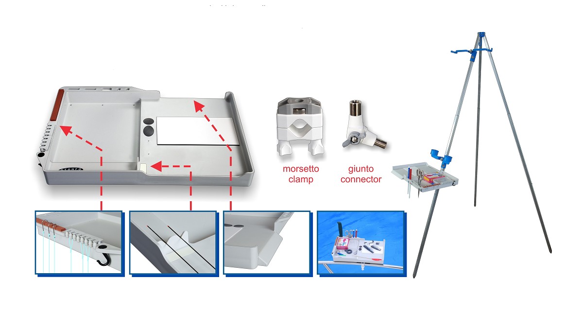 Serbidora in materiale plastico resistentissimo perfettamente smussato e privo di angoli taglienti. Munita di nicchia per contenere vaschette porta-esche e minuteria varia in modo stabile e sicuro. Molte altre caratteristiche importanti fanno di questa serbidora un vero e proprio completo banco di lavoro sia per la pesca da riva che dalla barca. Dimensioni cm 39x28. Fornita completa di morsetto e giunto regolabile per il fissaggio su tripode.