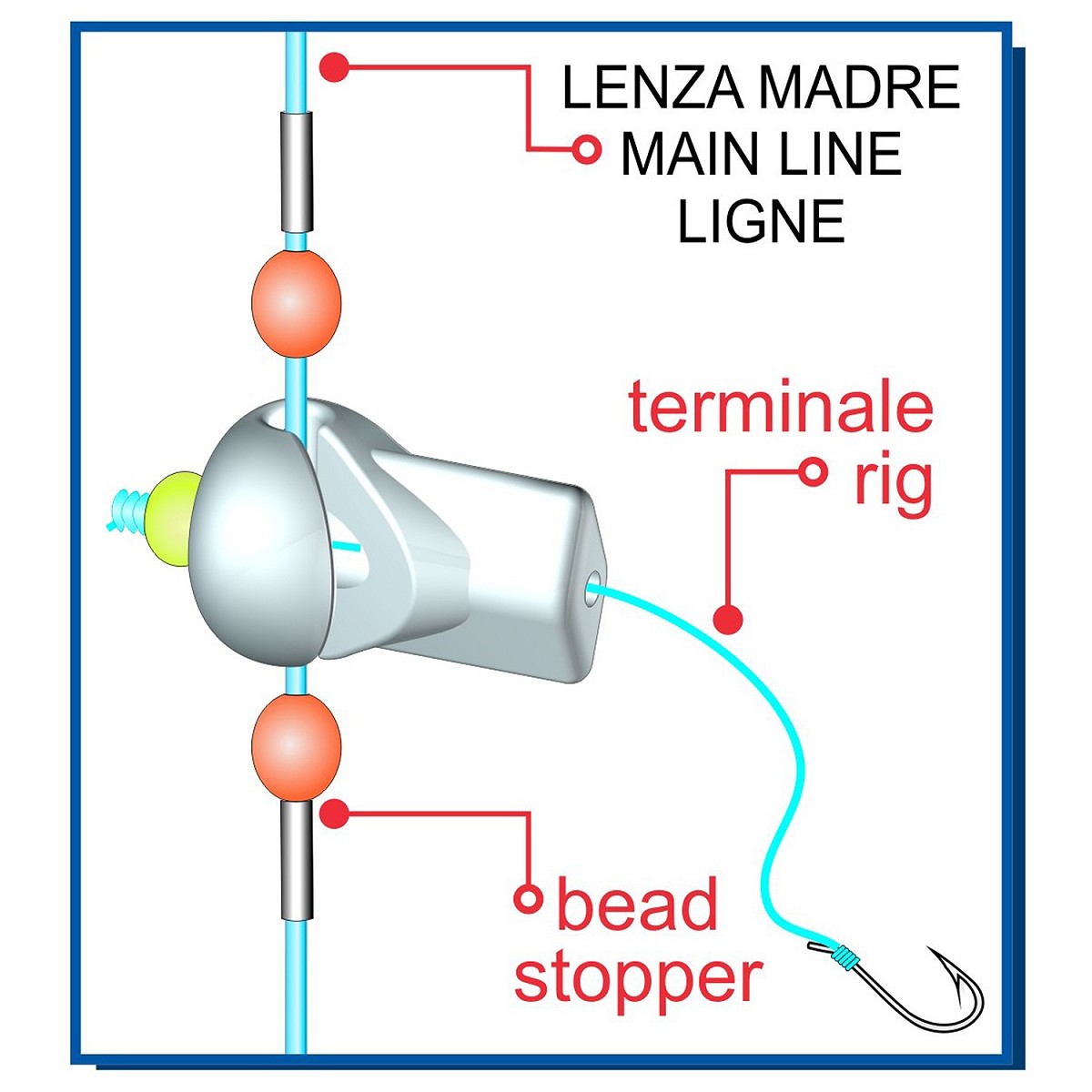 Perline per l’aggancio rapido dei finali alla lenza madre. Esse hanno un foro per il terminale e una traccia trasversale in cui, con una certa pressione, viene inserita la lenza madre. La loro speciale forma rende più semplice l’operazione di aggancio-sgancio. Prodotte in materiale resistentissimo trasparente.