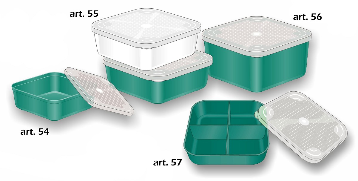 Quattro misure con coperchio forato e chiusura di sicurezza. L'art.55 è disponibile anche in colore bianco per visualizzare meglio alcuni tipi di esche come il ver de vase.