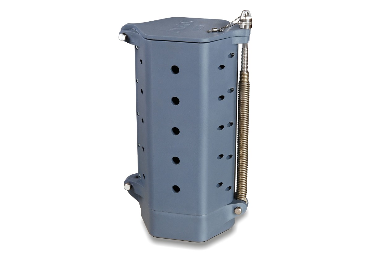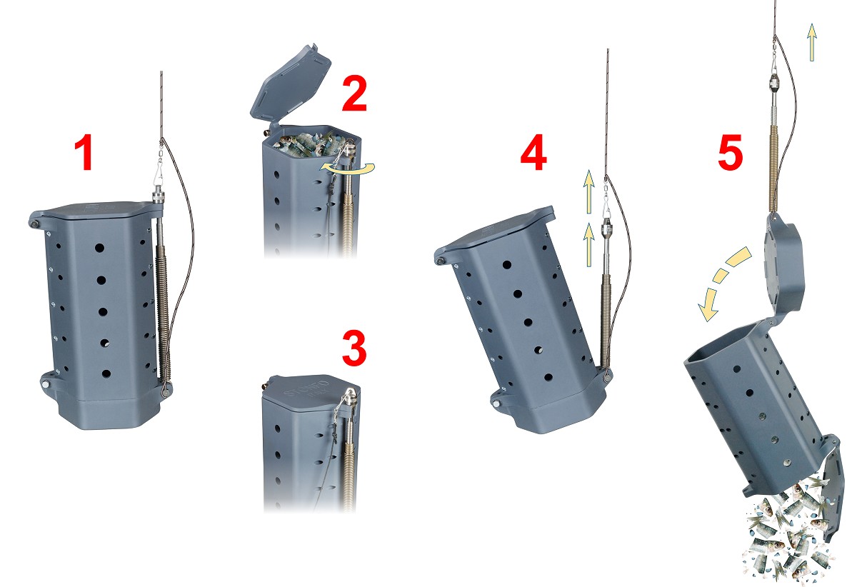 Pasturatore da barca ad apertura rapida. La sua capienza di Lt 1,7 ed il suo peso di Kg 1,4 lo rendono idoneo per la pesca su fondali di oltre 50 metri.Funzionamento: riempire il pasturatore, bloccare il coperchio e calarlo dalla barca con un cordino rigido alla profondità desiderata. Tirare bruscamente il cordino per permettere l’apertura e lo scaricamento del pasturatore.