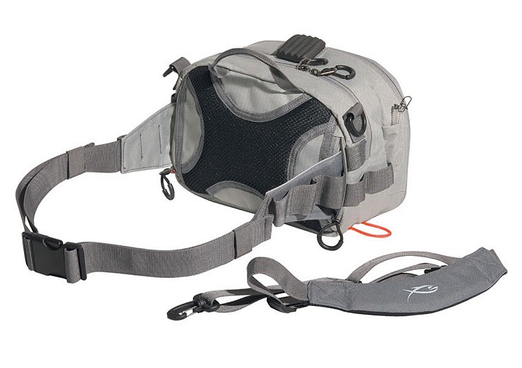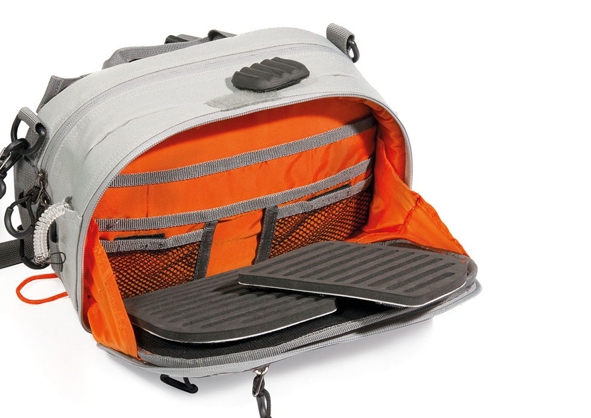 - Grande tasca sul fronte, ribaltabile per creare un momentaneo piano d’appoggio e dotata di rastrelliera per mosche e artificiali.