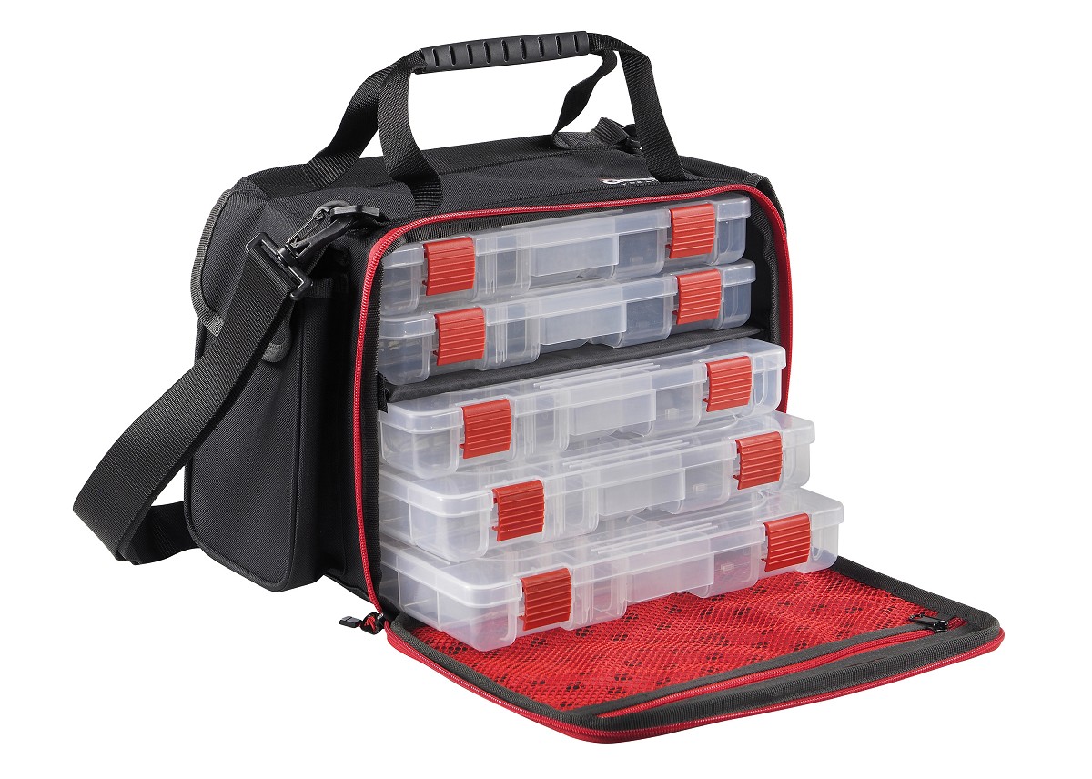 Borsa da lure fishing di media taglia comprensiva di 5 scatole portaesche ed accessori. Doppia tasca laterale e spallaccio regolabile dove applicare pinze e altri tools. Il fondo è semirigido e waterproof, e grazie alle cerniere di alta qualità sono utilizzabili anche in mare o in barca.