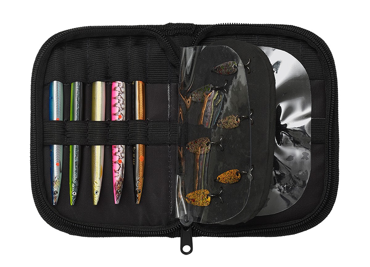 Pocket Zipper wallet made from Soft durable 600Denier fabric with inner lining elastic slots, and a foam wall, with PVC dividers. Perfect for a mix of line thru lures and rigged lures with treble hooks or single hooks. Holds 12 lures plus plenty space for hooks in the foam wall. Oversized nylon head zippers