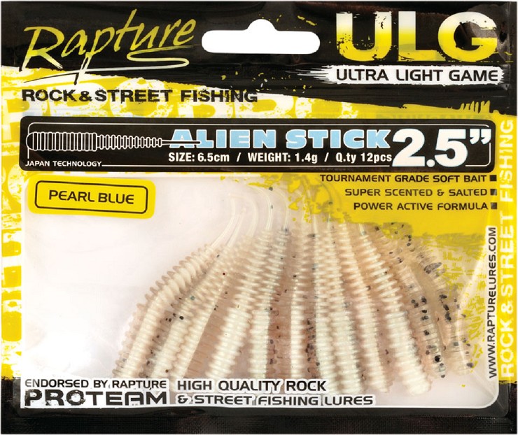 Worm di dimensioni medio piccole, che sfrutta il proprio corpo a compattezza variabile per attirare i predatori. La testa dell’Alien Stick è particolarmente compatta per permettere un innesco sicuro e che non rovini il silicone. La parte centrale è molto sottile ma dotata di grandi costole, così da permettere un nuoto sinuoso e ricchissimo di vibrazioni. La parte terminale è composta da una codina estremamente mobile che, se ce ne fosse il bisogno, toglierebbe ogni dubbio al predatore di turno. Davvero in grado di catturare di tutto, dalla trota al persico, passando per black bass e persino spigole in mare.