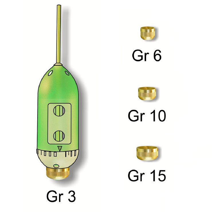 Pasturatore scorrevole con regolazione della grandezza dei fori consente di variare il flusso delle esche. Fornito con 4 pesi diversi intercambiabili rapidamente.