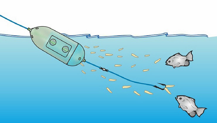 Pasturatore galleggiante scorrevole. Anche se pieno di esche (circa gr 15 di bigattini) si mantiene a galla. La regolazione della grandezza dei fori consente di variare il flusso delle esche.