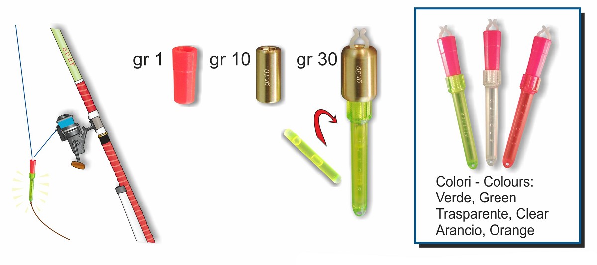 Segnalatore d’abboccata con pesi intercambiabili, adatto per il surfcasting ed il carpfishing. Munito di pinzetta con regolazione della tensione per lo sgancio del filo e alloggiamento per starlight di mm 3 e 4,5. Fornito completo di pesi di gr 1 - 10 - 30.