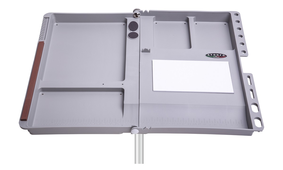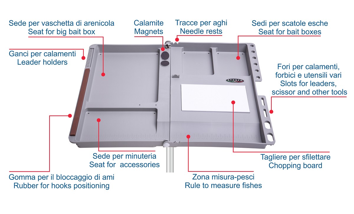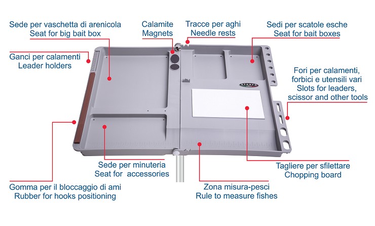 Serbidora ripiegabile e leggera progettata per venire incontro alle molteplici esigenze del pescatore. La sua struttura in materiale plastico resistentissimo è perfettamente smussata e priva di angoli taglienti. Le nicchie di cui è munita possono contenere varie vaschette porta esche in posizione perfettamente stabile. Altre caratteristiche importanti fanno di questa serbidora un vero e proprio completo banco di lavoro. Attacco a vite metallica universale per paletto posto centralmente.