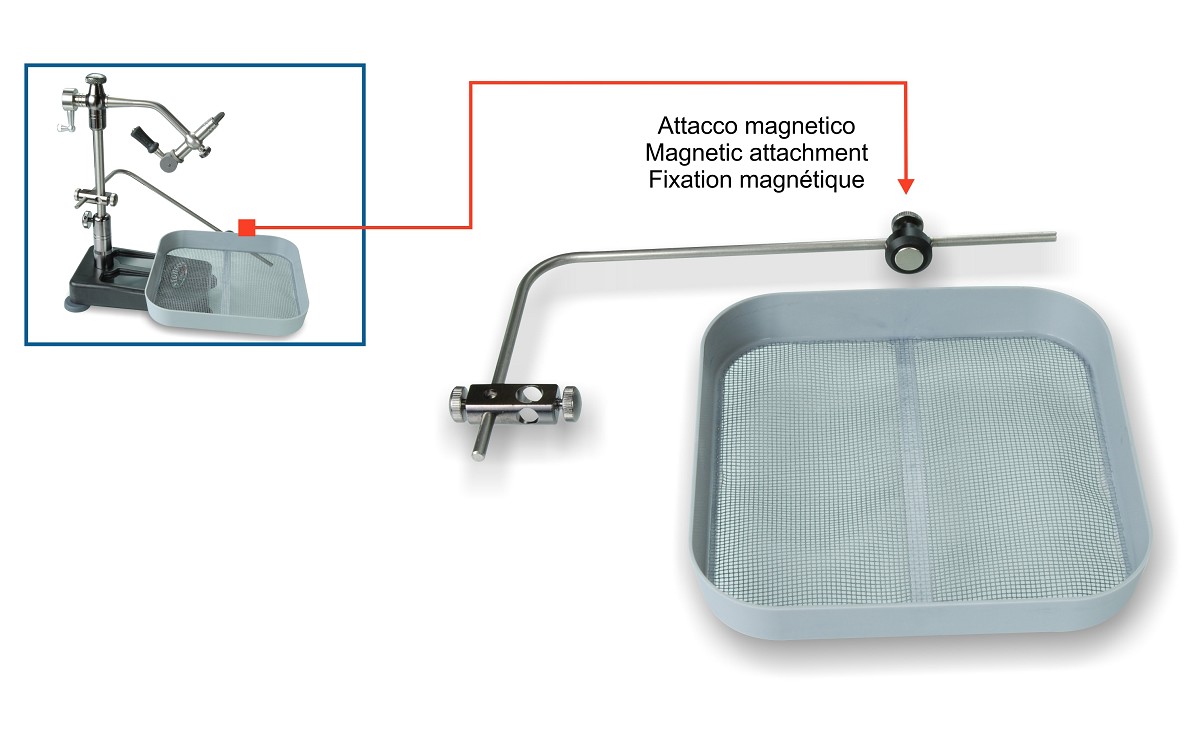 Vaschetta raccogli-sporco con fondo a rete antistatica, si fissa all’asta del morsetto tramite un supporto inox che ne consente una precisa regolazione della posizione. Occupa poco spazio in altezza e si toglie in un attimo grazie allo speciale attacco magnetico. Applicabile su morsetti con asta da 8 a 10 mm.