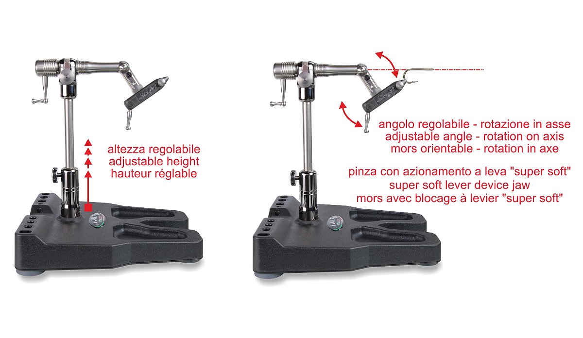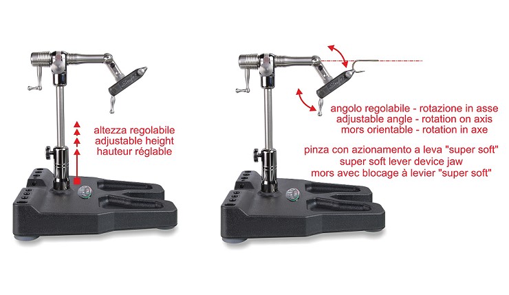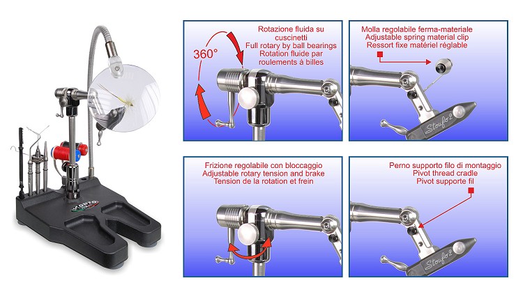 Morsetto rotante in asse a 360° di alta qualità per la costruzione di mosche ed esche artificiali con albero porta pinza in acciaio inox supportato da due cuscinetti a sfera di precisione. L'albero porta pinza snodato permette l'allineamento del gambo dell'amo all'asse di rotazione. La base di cui è dotato è molto stabile ed è munita di nicchie e di un pratico porta utensili integrato. Altre importanti caratteristiche: intercambiabilità della pinza, bloccaggio dell’amo mediante leva ad azione "super soft", frizione progressiva sul movimento di rotazione, blocco della rotazione in qualsiasi posizione, regolazione in altezza, adattamento per mancini. Altri prodotti inclusi: supporto bobinatore-parachute in acciaio inox sagomato ad U con pinzetta parachute e accessori, molla blocca-materiale regolabile, perno di supporto filo di montaggio, chiavi a brugola e istruzioni d’uso.