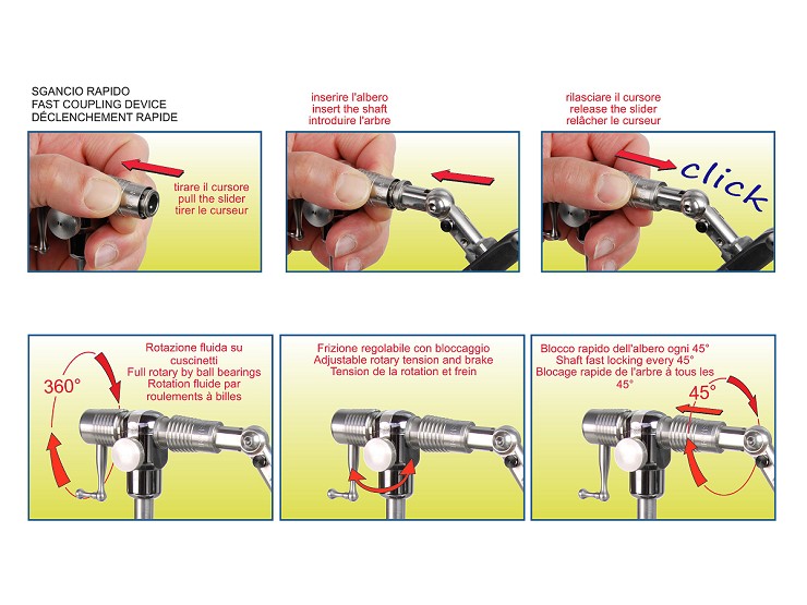 Il Transformer è un prodotto di alta qualità che, grazie ad un dispositivo innovativo di sgancio rapido dell'albero, si trasforma in un attimo in un morsetto in linea o in un morsetto per la costruzione di tube-fly oppure in un morsetto per la realizzazione di streamers. Tre morsetti in uno con un semplice click. Costruito in acciaio inox con albero rotante su cuscinetti per una fluida rotazione. Tutti i componenti che compongono i tre morsetti sono inclusi con il Transformer. La base molto stabile è munita di nicchie e di un pratico porta utensili integrato con attacco per lente d'ingrandimento art. 642 (utensili e lente non inclusi). Altre importanti caratteristiche del Transformer sono: intercambiabilità delle pinze, frizione progressiva sul movimento di rotazione, blocco della rotazione in qualsiasi posizione, blocco rapido della rotazione a step di 45°, regolazione in altezza, adattamento per mancini. Altri accessori inclusi: supporto bobinatore-parachute in acciaio inox sagomato ad U con pinzetta parachute e accessori, molla blocca-materiale regolabile, perno di supporto, chiavi a brugola e istruzioni d'uso.