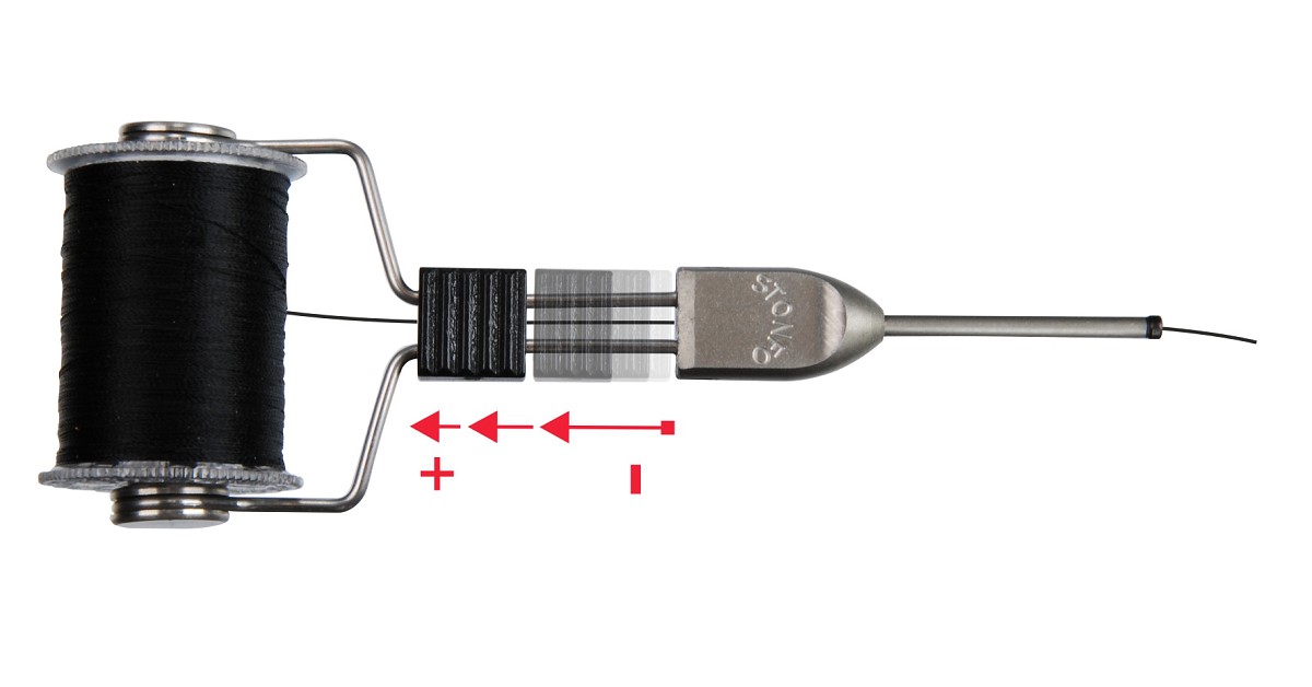 Bobinatore in acciaio inox con tensionamento del filo regolabile tramite cursore. Permette un cambio rapido della bobina. Il tubetto scorrifilo ha alla sua estremità una boccola in acciaio temprato resistentissima all'usura e agli urti. Perfettamente bilanciato durante la rotazione è ideale nella realizzazione di dubbing in asola creata dividendo il filo.